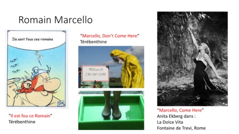 Romain Marcello “Marcello, Don’t Come Here” Térébenthine “Marcello, Come Here” “Il est fou ce Romain” Anita Ekberg dans : Térébenthine La Dolce Vita Fontaine de Trevi, Rome
