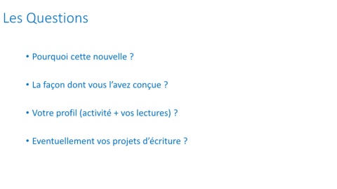 Les Questions • Pourquoi cette nouvelle ? • La façon dont vous l’avez conçue ? • Votre profil (activité + vos lectures) ? • Eventuellement vos projets d’écriture ?
