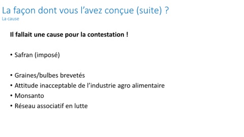 La façon dont vous l’avez conçue (suite) ? La cause Il fallait une cause pour la contestation ! • Safran (imposé) • Graines/bulbes brevetés • Attitude inacceptable de l’industrie agro alimentaire • Monsanto • Réseau associatif en lutte