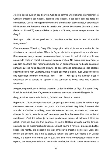 monte, elle descend, elle a mal au cœur, le vertige, elle vomit sur l’épaule d’un Cassel