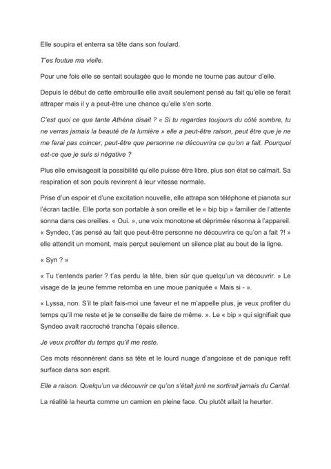 « Lyssa, non. S’il te plait fais-moi une faveur et ne m’appelle plus, je veux profiter du