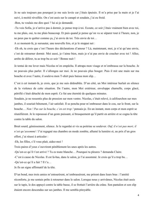 ne pouvais plus parler. Il s’allongea sur moi. Je ne pouvais plus bouger. Puis il mit une main sur ma