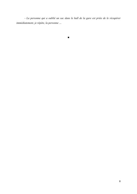 - La personne qui a oublié un sac dans le hall de la gare est priée de le récupérer immédiatement, je répète, la personne … ■ 8