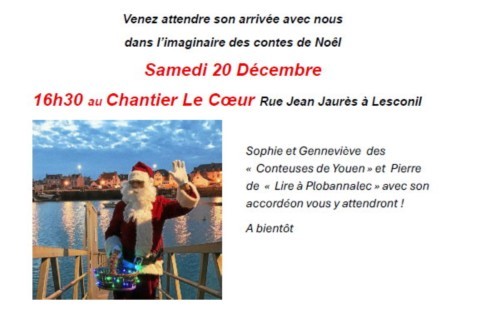 L association "Lire à Plobannalec-Lesconil" vous propose Samedi 20 décembre une heure de contes au Chantier Le Coeur en partenariat avec Bag Leskon et les amis de Youen Durand. la séance se clôturera avec une déambulation vers le port pour accueillir le Père Noël - Gratuit