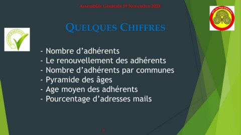 Assemblée Générale 19 Novembre 2024 QUELQUES CHIFFRES - Nombre d’adhérents - Le renouvellement des adhérents - Nombre d’adhérents par communes - Pyramide des âges - Age moyen des adhérents - Pourcentage d’adresses mails 19
