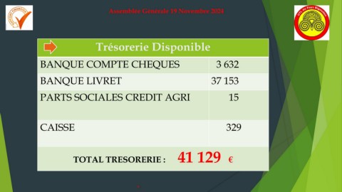 Assemblée Générale 19 Novembre 2024 Trésorerie Disponible BANQUE COMPTE CHEQUES 3 632 BANQUE LIVRET 37 153 PARTS SOCIALES CREDIT AGRI 15 CAISSE 329 TOTAL TRESORERIE : 41 129 € 9
